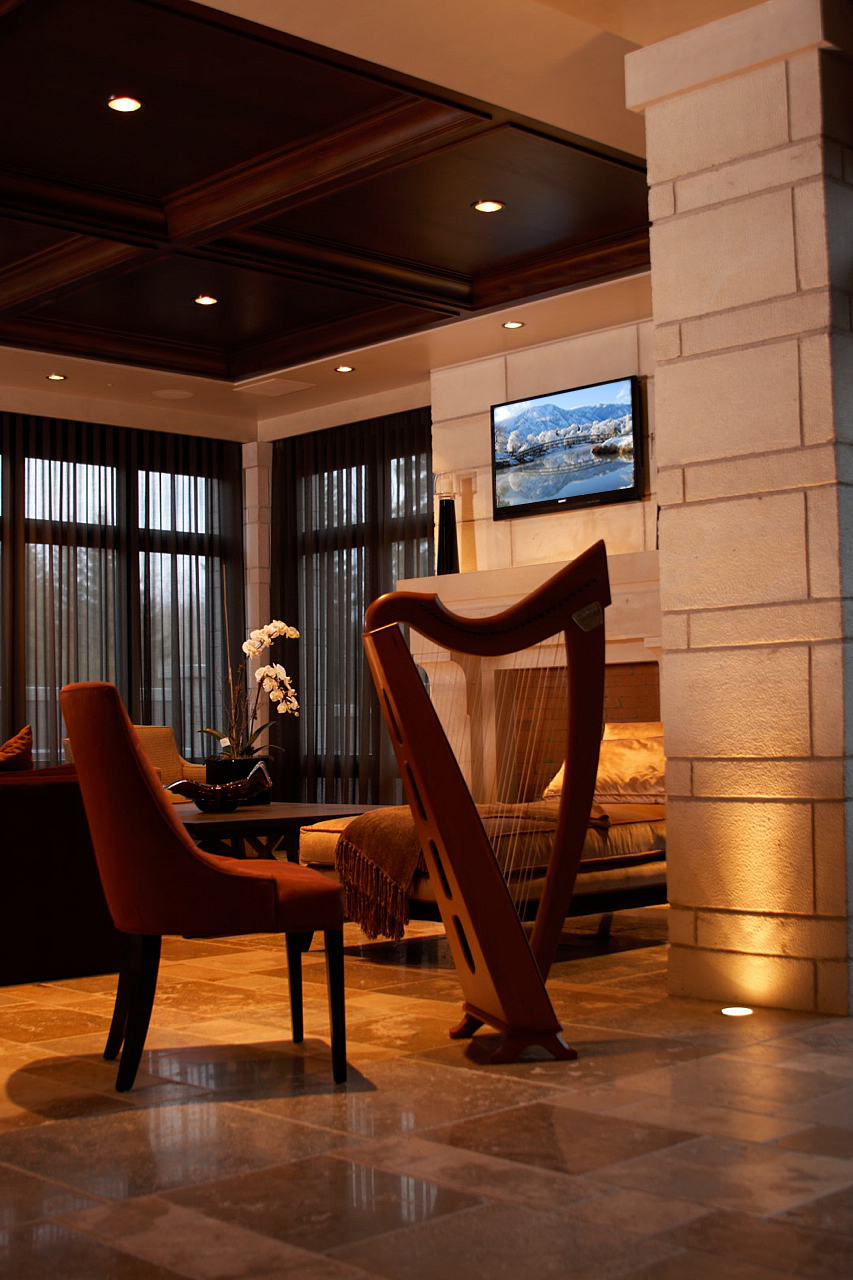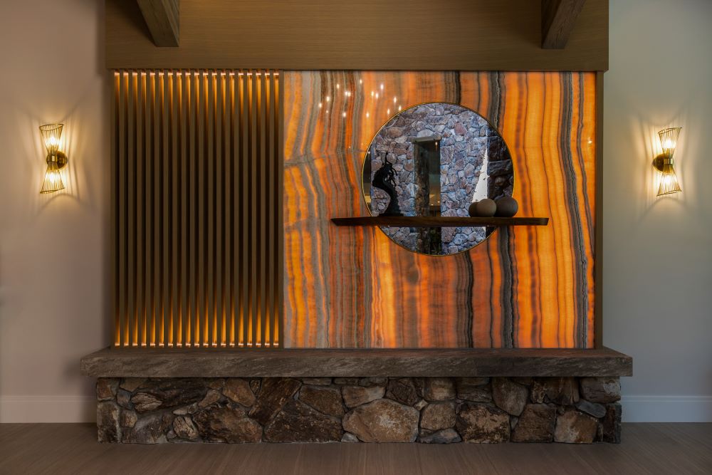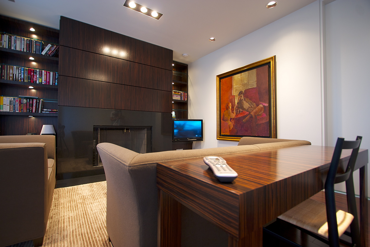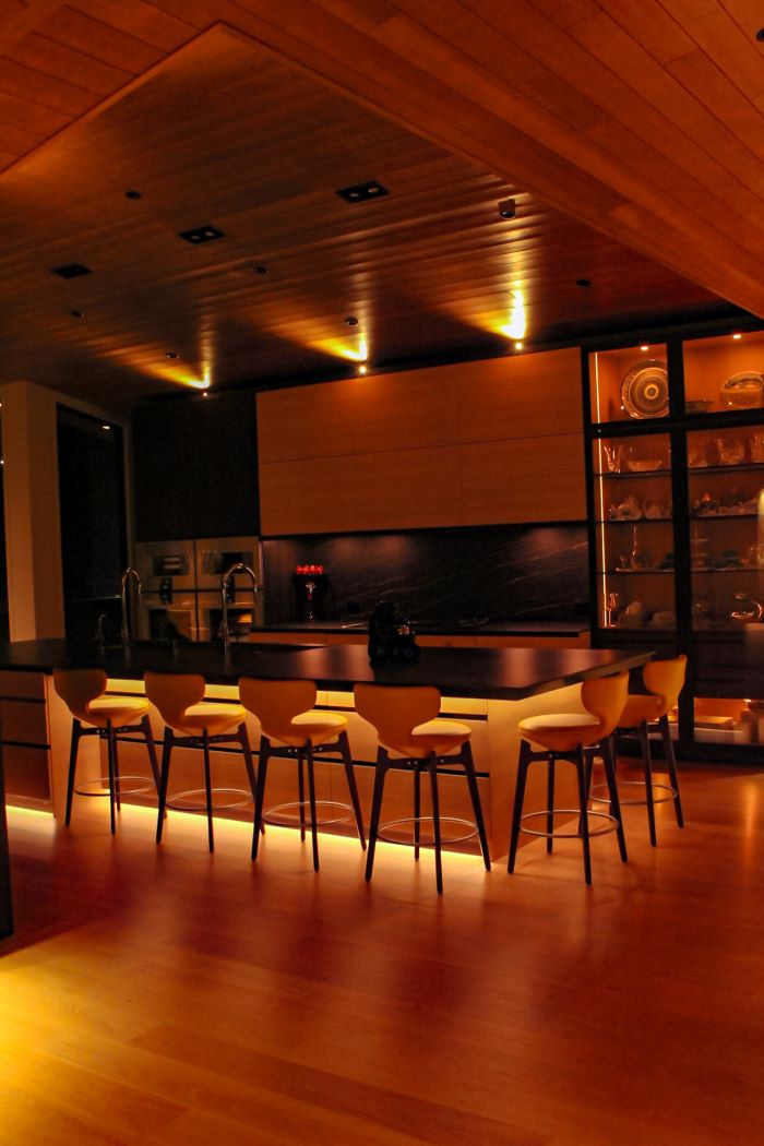 The star of the show in this warm environment is the stunning backlit stone display, complimented by accent lights and a display TV that barely comes out from the wall, all wrapped up in a fully integrated bow.