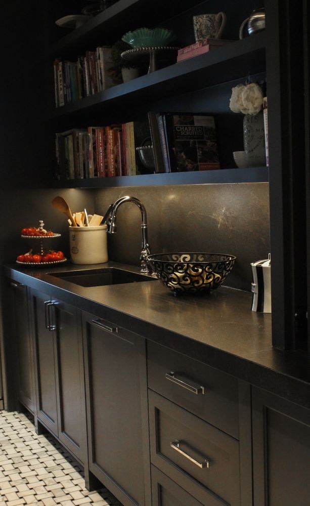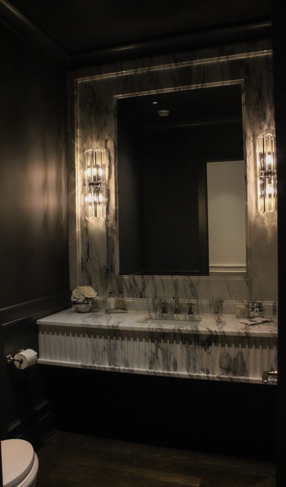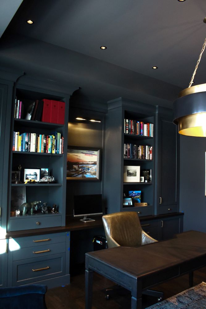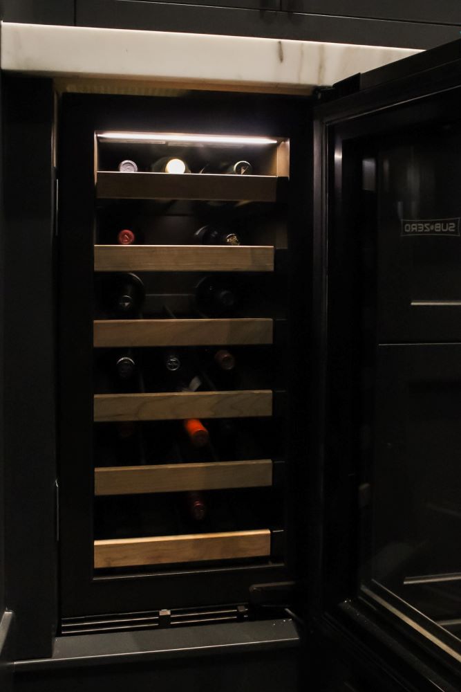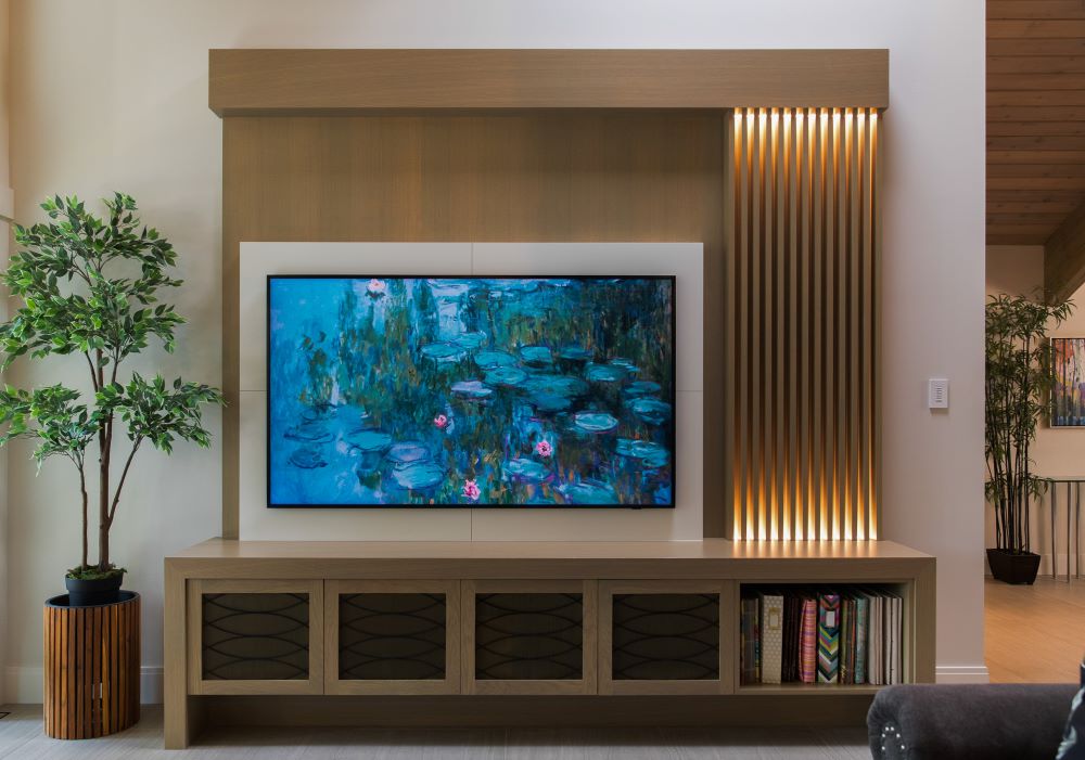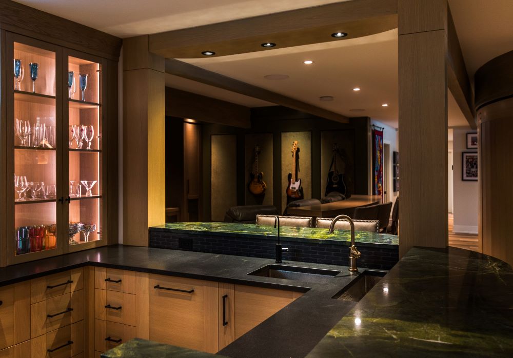 The star of the show in this warm environment is the stunning backlit stone display, complimented by accent lights and a display TV that barely comes out from the wall, all wrapped up in a fully integrated bow.